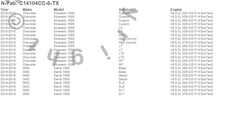 Below is an abbreviated list of applications for the Wheel To Wheel Nerf Step Bar.Sierra 1500, Silverado 1500, Chevrolet, GMC, 2018, 2017, 2016, 2015, 2014