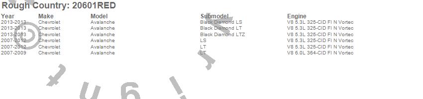 Below is an abbreviated list of applications for the Lift Kit-Suspension.Avalanche, Chevrolet, 2013, 2012, 2011, 2010, 2009, 2008, 2007