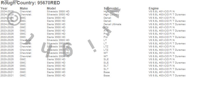 Below is an abbreviated list of applications for the Suspension Lift Kit w/Shocks.Sierra 3500 HD, Silverado 3500 HD, Chevrolet, GMC, 2025, 2024, 2023, 2022, 2021, 2020