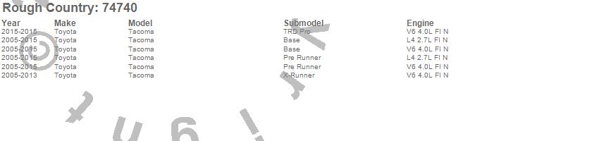 Below is an abbreviated list of applications for the Suspension Lift Kit w/Shocks.Tacoma, Toyota, 2015, 2014, 2013, 2012, 2011, 2010, 2009, 2008, 2007, 2006, 2005