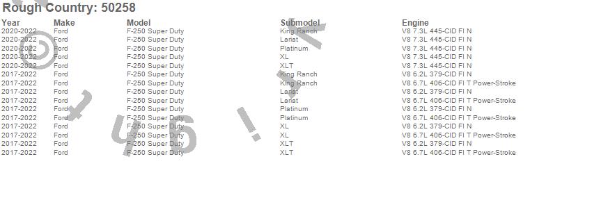 Brand: Rough CountryPart Number: 50258Lift Kit-Suspension w/Shock Type: 3 in. Lift - GasUPC: 840269939679