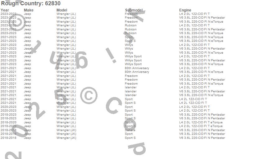 Below is an abbreviated list of applications for the Suspension Lift Kit w/Shocks.Wrangler (JK), Wrangler (JL), Jeep, 2023, 2022, 2021, 2020, 2019, 2018