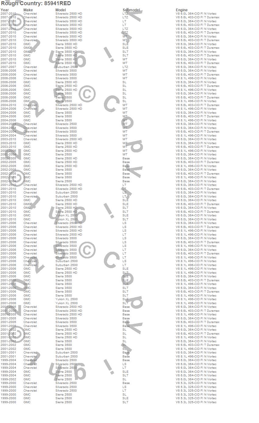 Below is an abbreviated list of applications for the Suspension Lift Kit w/Shocks.Sierra 2500, Sierra 2500 HD, Sierra 3500, Sierra 3500 HD, Silverado 2500, Silverado 2500 HD, Silverado 3500, Silverado 3500 HD, Suburban 2500, Yukon XL 2500, Chevrolet, GMC, 2010, 2009, 2008, 2007, 2006, 2005, 2004, 2003