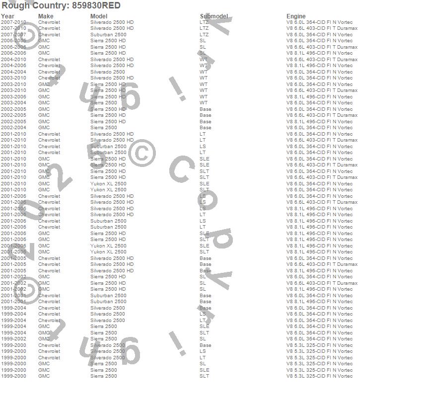 Below is an abbreviated list of applications for the Suspension Lift Kit w/Shocks.Sierra 2500, Sierra 2500 HD, Silverado 2500, Silverado 2500 HD, Suburban 2500, Yukon XL 2500, Chevrolet, GMC, 2010, 2009, 2008, 2007, 2006, 2005, 2004, 2003, 2002, 2001, 2000, 1999