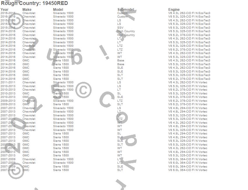 Below is an abbreviated list of applications for the Suspension Lift Kit w/Shocks.Sierra 1500, Silverado 1500, Chevrolet, GMC, 2016, 2015, 2014, 2013, 2012, 2011, 2010, 2009, 2008, 2007
