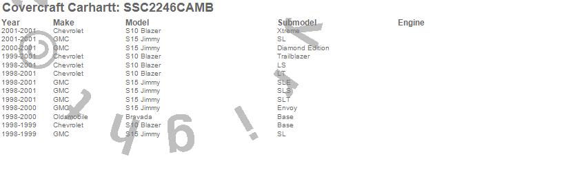 Below is an abbreviated list of applications for the Covercraft Carhartt SeatSaver.Bravada, S10 Blazer, S15 Jimmy, Chevrolet, GMC, Oldsmobile, 2001, 2000, 1999, 1998