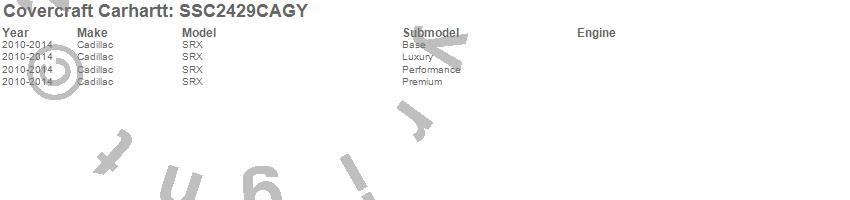 Below is an abbreviated list of applications for the Covercraft Carhartt SeatSaver.SRX, Cadillac, 2014, 2013, 2012, 2011, 2010