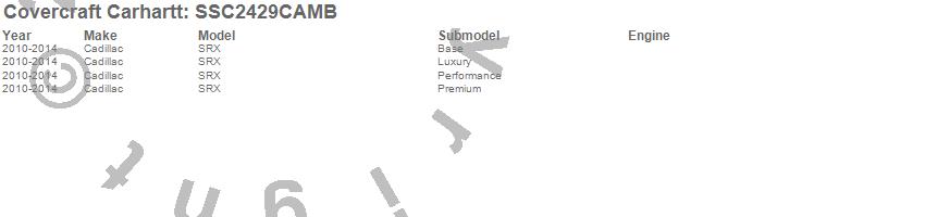Below is an abbreviated list of applications for the Covercraft Carhartt SeatSaver.SRX, Cadillac, 2014, 2013, 2012, 2011, 2010