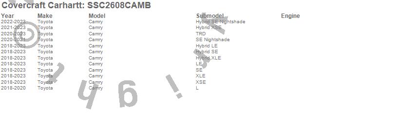 Below is an abbreviated list of applications for the Covercraft Carhartt SeatSaver.Camry, Toyota, 2024, 2023, 2022, 2021, 2020, 2019, 2018