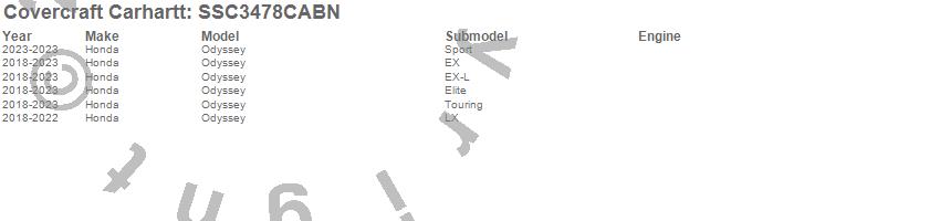 Below is an abbreviated list of applications for the Covercraft Carhartt SeatSaver.Odyssey, Honda, 2025, 2024, 2023, 2022, 2021, 2020, 2019, 2018