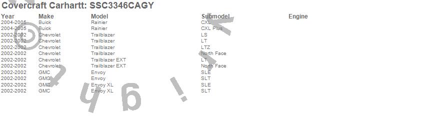 Below is an abbreviated list of applications for the Covercraft Carhartt SeatSaver.Envoy, Envoy XL, Rainier, Trailblazer, Trailblazer EXT, Buick, Chevrolet, GMC, 2005, 2004, 2002