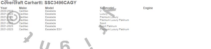 Below is an abbreviated list of applications for the Covercraft Carhartt SeatSaver.Escalade, Escalade ESV, Cadillac, 2025, 2024, 2023, 2022, 2021