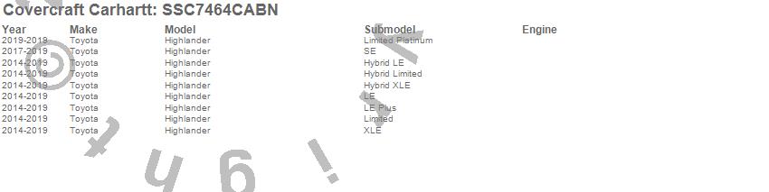 Below is an abbreviated list of applications for the Covercraft Carhartt SeatSaver.Highlander, Toyota, 2019, 2018, 2017, 2016, 2015, 2014