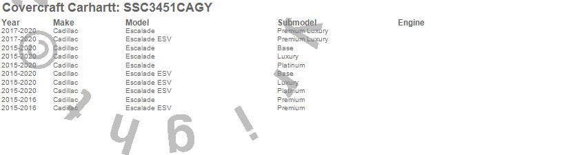 Below is an abbreviated list of applications for the Covercraft Carhartt SeatSaver.Escalade, Escalade ESV, Cadillac, 2020, 2019, 2018, 2017, 2016, 2015