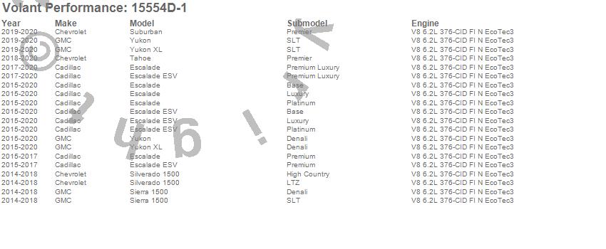 Below is an abbreviated list of applications for the DryTech Filter Closed Box Air Intake.Escalade, Escalade ESV, Sierra 1500, Silverado 1500, Suburban, Tahoe, Yukon, Yukon XL, Cadillac, Chevrolet, GMC, 2020, 2019, 2018, 2017, 2016, 2015, 2014