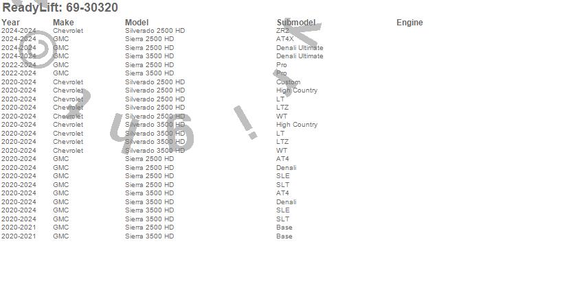Below is an abbreviated list of applications for the SST Lift Kit w/Shocks.Sierra 2500 HD, Sierra 3500 HD, Silverado 2500 HD, Silverado 3500 HD, Chevrolet, GMC, 2024, 2023, 2022, 2021, 2020