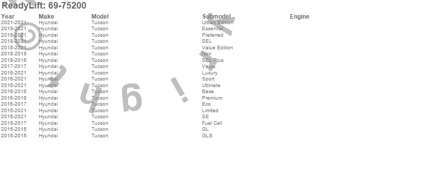 Below is an abbreviated list of applications for the SST Lift Kit.Tucson, Hyundai, 2021, 2020, 2019, 2018, 2017, 2016, 2015