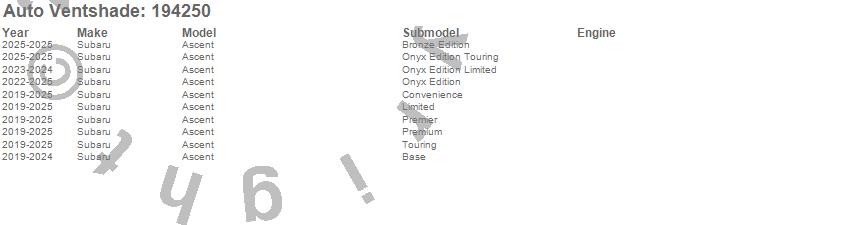 Below is an abbreviated list of applications for the Ventvisor In-Channel Deflector 4 pc..Ascent, Subaru, 2025, 2024, 2023, 2022, 2021, 2020, 2019