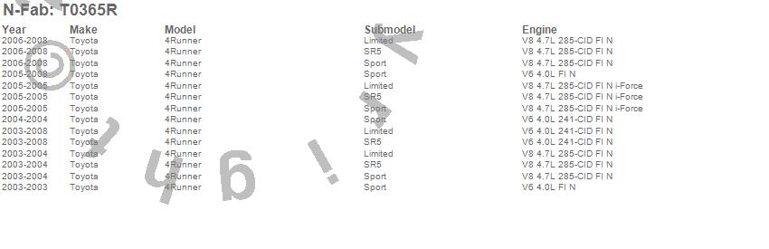 Below is an abbreviated list of applications for the Wheel To Wheel Nerf Step Bar.4Runner, Toyota, 2008, 2007, 2006, 2005, 2004, 2003