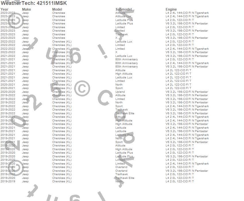 Below is an abbreviated list of applications for the SeatBack Cargo Liner HP w/Bumper Protector.Cherokee, Cherokee (KL), Jeep, 2023, 2022, 2021, 2020, 2019
