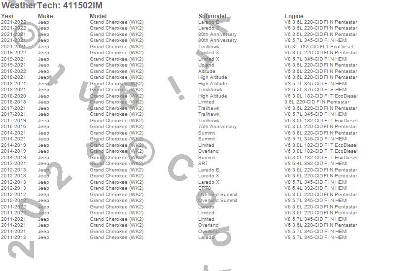Below is an abbreviated list of applications for the SeatBack Cargo Liner HP.Grand Cherokee (WK2), Jeep, 2022, 2021, 2020, 2019, 2018, 2017, 2016, 2015, 2014, 2013, 2012, 2011
