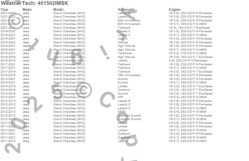 Below is an abbreviated list of applications for the SeatBack Cargo Liner HP w/Bumper Protector.Grand Cherokee (WK2), Jeep, 2022, 2021, 2020, 2019, 2018, 2017, 2016, 2015, 2014, 2013, 2012, 2011
