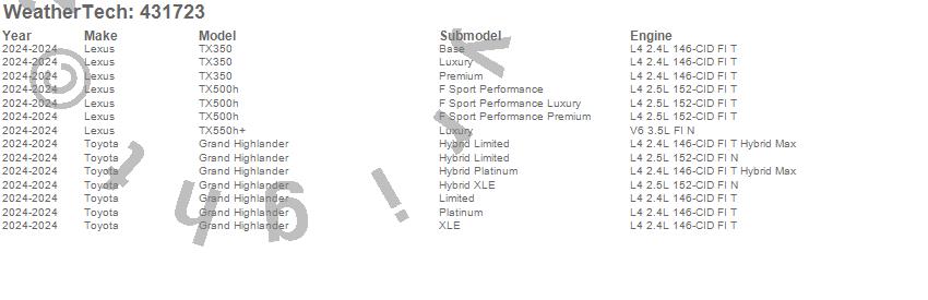 Below is an abbreviated list of applications for the Cargo Liner.Grand Highlander, TX350, TX500h, TX550h+, Lexus, Toyota, 2026, 2025, 2024