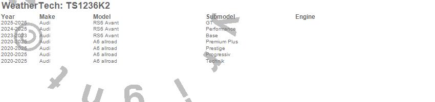 Below is an abbreviated list of applications for the WeatherTech SunShade Full Vehicle Kit.A6 allroad, RS6 Avant, Audi, 2026, 2025, 2024, 2023, 2022, 2021, 2020