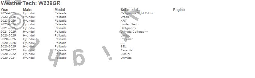 Below is an abbreviated list of applications for the All Weather Floor Mats.Palisade, Hyundai, 2025, 2024, 2023, 2022, 2021, 2020