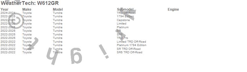 Below is an abbreviated list of applications for the All Weather Floor Mats.Tundra, Toyota, 2025, 2024, 2023, 2022
