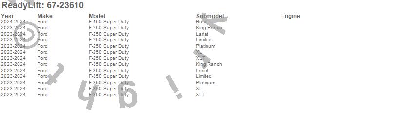 Below is an abbreviated list of applications for the Auto-Leveling Headlight Bracket.E-450 Super Duty, F-250 Super Duty, F-350 Super Duty, F-450 Super Duty, Ford, 2025, 2024, 2023