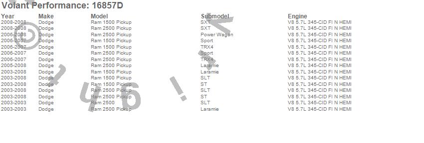 Below is an abbreviated list of applications for the Cold Air Intake Kit.Ram 1500, Ram 2500, Dodge, 2008, 2007, 2006, 2005, 2004, 2003