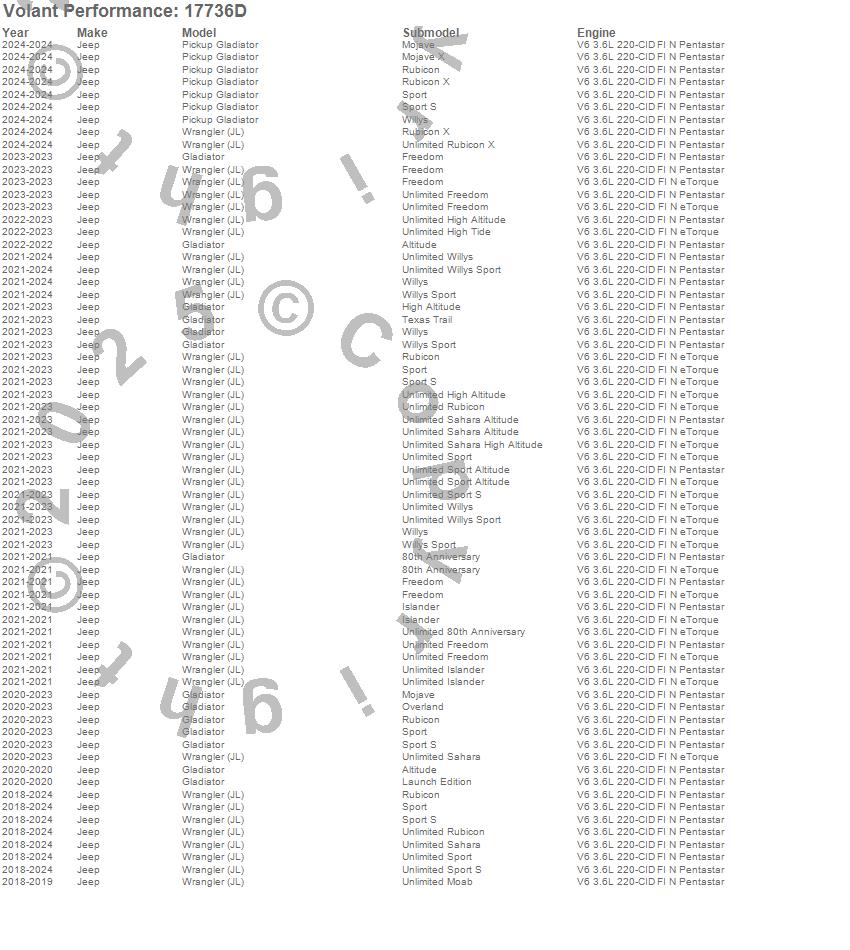 Below is an abbreviated list of applications for the Cold Air Intake Kit.Gladiator, Pickup Gladiator, Wrangler (JL), Jeep, 2024, 2023, 2022, 2021, 2020, 2019, 2018