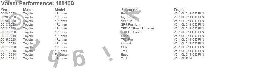 Below is an abbreviated list of applications for the Cold Air Intake Kit.4Runner, FJ Cruiser, Toyota, 2020, 2019, 2018, 2017, 2016, 2015, 2014, 2013, 2012, 2011