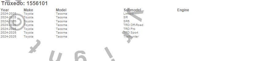 Brand: TruxedoPart Number: 1556101Tonneau Cover Type: BlackUPC: 845742020028