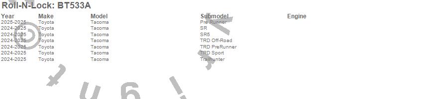 Below is an abbreviated list of applications for the Roll-N-Lock A-Series Truck Bed Cover.Tacoma, Toyota, 2025, 2024