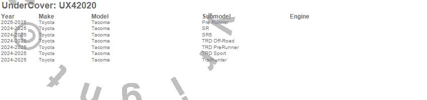 Brand: UnderCoverPart Number: UX42020Tonneau Cover Type: Matte BlackUPC: 840114337056