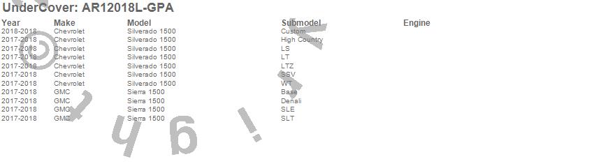 Brand: UnderCoverPart Number: AR12018L-GPATonneau Cover Type: GasolineUPC: 810011857605