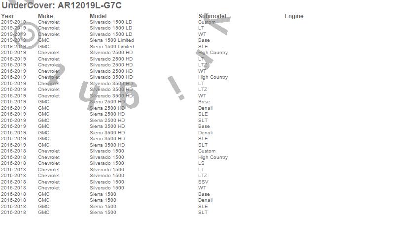 Below is an abbreviated list of applications for the UnderCover Fusion.Sierra 1500, Sierra 1500 Limited, Sierra 2500 HD, Sierra 3500 HD, Silverado 1500, Silverado 1500 LD, Silverado 2500 HD, Silverado 3500 HD, Chevrolet, GMC, 2019, 2018, 2017, 2016