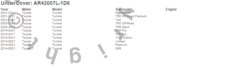 Below is an abbreviated list of applications for the UnderCover Fusion.Tundra, Toyota, 2021, 2020, 2019, 2018, 2017, 2016, 2015, 2014