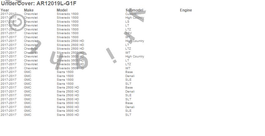 Below is an abbreviated list of applications for the UnderCover Fusion.Sierra 1500, Sierra 2500 HD, Sierra 3500 HD, Silverado 1500, Silverado 2500 HD, Silverado 3500 HD, Chevrolet, GMC, 2017