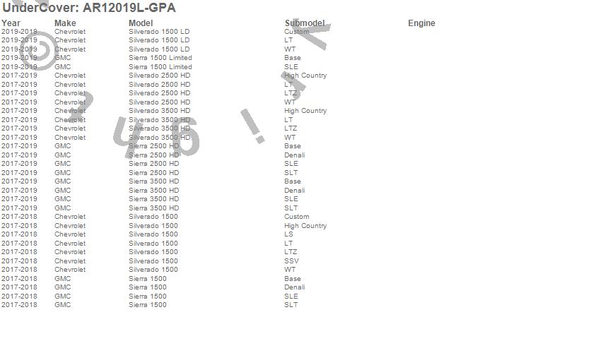 Below is an abbreviated list of applications for the UnderCover Fusion.Sierra 1500, Sierra 1500 Limited, Sierra 2500 HD, Sierra 3500 HD, Silverado 1500, Silverado 1500 LD, Silverado 2500 HD, Silverado 3500 HD, Chevrolet, GMC, 2019, 2018, 2017