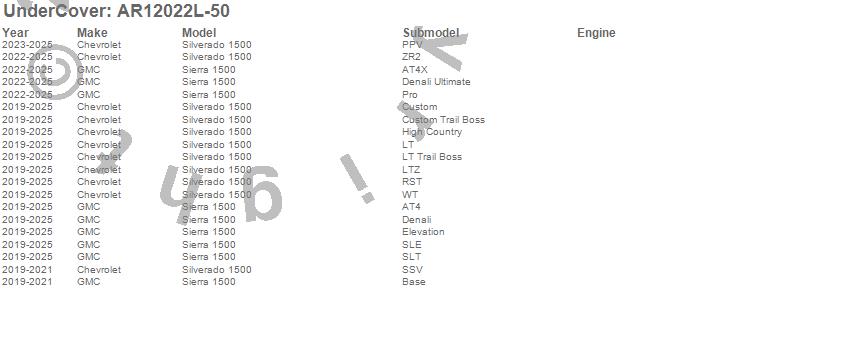 Below is an abbreviated list of applications for the UnderCover Fusion.Sierra 1500, Silverado 1500, Chevrolet, GMC, 2025, 2024, 2023, 2022, 2021, 2020, 2019