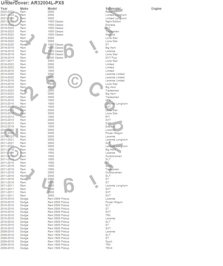 Below is an abbreviated list of applications for the UnderCover Fusion.1500, 1500 Classic, 2500, 3500, Ram 1500, Ram 2500, Ram 3500, Dodge, Ram, 2023, 2022, 2021, 2020, 2019, 2018, 2017, 2016, 2015, 2014, 2013