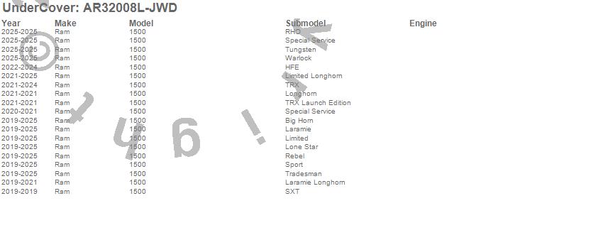 Below is an abbreviated list of applications for the UnderCover Fusion.1500, Ram, 2025, 2024, 2023, 2022, 2021, 2020, 2019