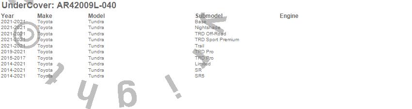 Below is an abbreviated list of applications for the UnderCover Fusion.Tundra, Toyota, 2021, 2020, 2019, 2018, 2017, 2016, 2015, 2014