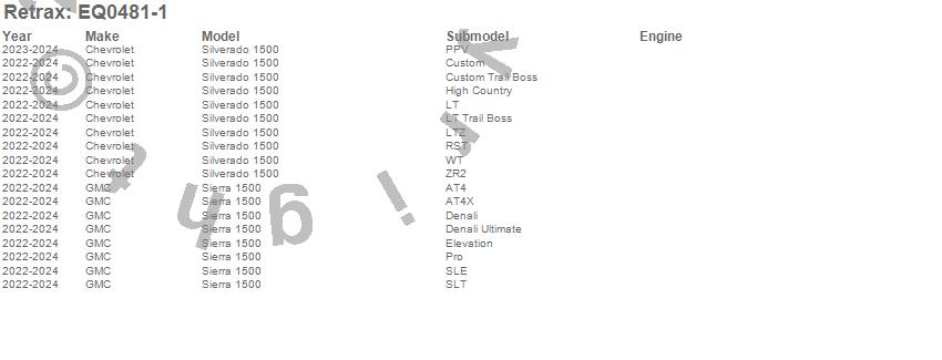 Below is an abbreviated list of applications for the Retrax EQ Retractable Tonneau Cover.Sierra 1500, Silverado 1500, Chevrolet, GMC, 2026, 2024, 2023, 2022