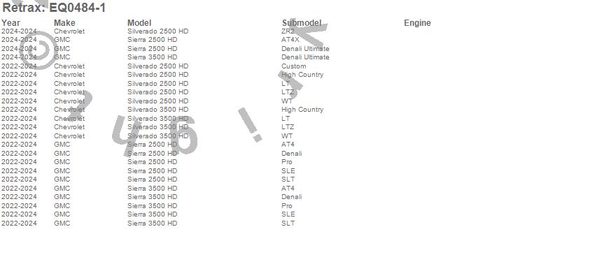 Below is an abbreviated list of applications for the Retrax EQ Retractable Tonneau Cover.Sierra 2500 HD, Sierra 3500 HD, Silverado 2500 HD, Silverado 3500 HD, Chevrolet, GMC, 2026, 2025, 2024, 2023, 2022