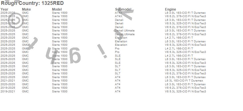 Below is an abbreviated list of applications for the Suspension Leveling Lift Kit.Sierra 1500, GMC, 2025, 2024, 2023, 2022, 2021, 2020, 2019