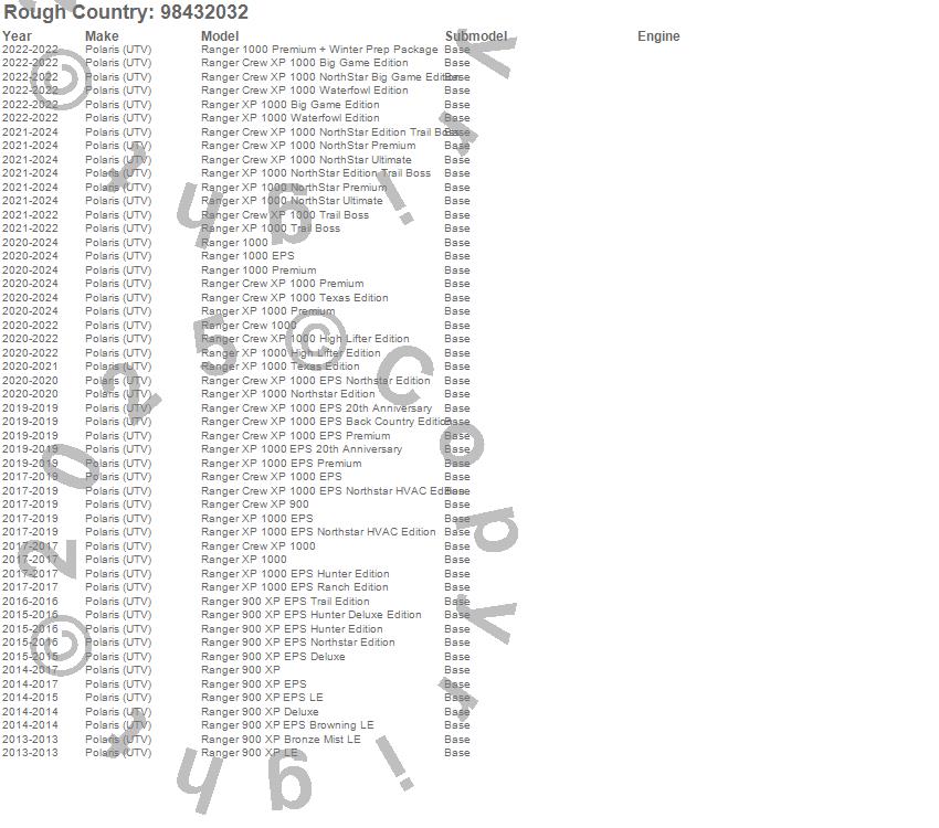 Below is an abbreviated list of applications for the Rear Panel.Ranger 1000, Ranger 1000 EPS, Ranger 1000 Premium, Ranger 1000 Premium + Winter Prep Package, Ranger 900 XP, Ranger 900 XP Bronze Mist LE, Ranger 900 XP Deluxe, Ranger 900 XP EPS, Ranger 900 XP EPS Browning LE, Ranger 900 XP EPS Deluxe, Ranger 900 XP EPS Hunter Deluxe Edition, Ranger 900 XP EPS Hunter Edition, Ranger 900 XP EPS LE, Ranger 900 XP EPS Northstar Edition, Ranger 900 XP EPS Trail Edition, Ranger 900 XP LE, Ranger Crew 1000, Ranger Crew XP 1000, Ranger Crew XP 1000 Big Game Edition, Ranger Crew XP 1000 EPS